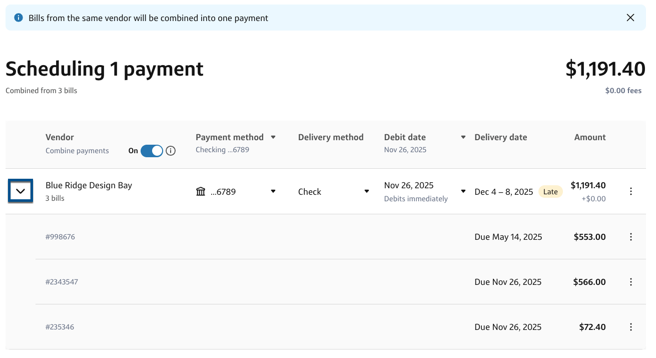 5- The bills will now appear as a single payment with a combined amount. Use the dropdown arrow next to the vendor name to see the details for all the payments.