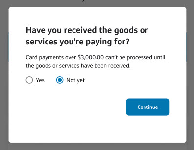 Card payments over $3,000.00 can’t be processed until the goods or services have been received. When you select to make such payments with a Capital One Business card or debit card, you’ll be asked if you have already received the service or goods.