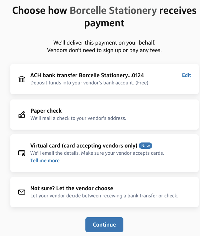 8. Lastly, choose how your vendor receives the payment. We pay vendors on your behalf. Vendors don't need to sign up or pay any fees.