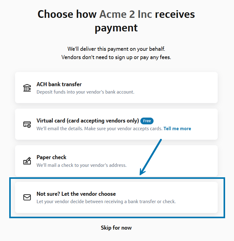2 - When asked how your vendor would like to receive payment, select Not sure? Let the vendor choose.