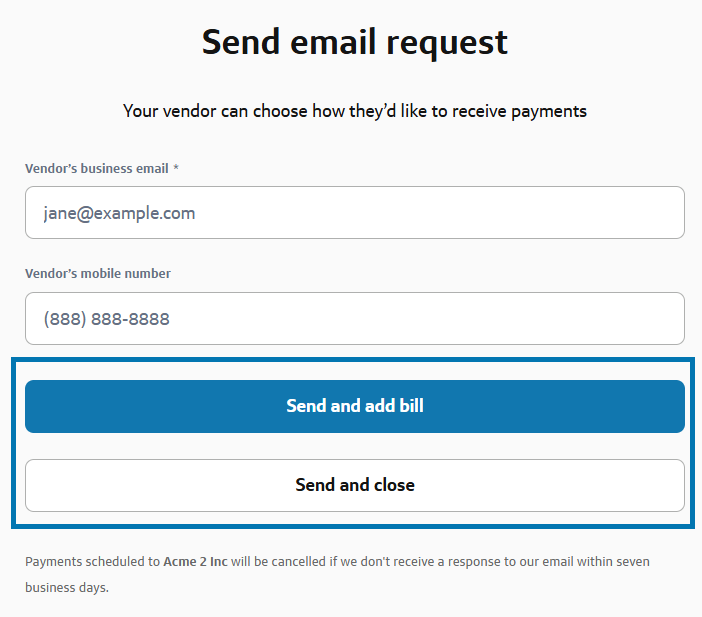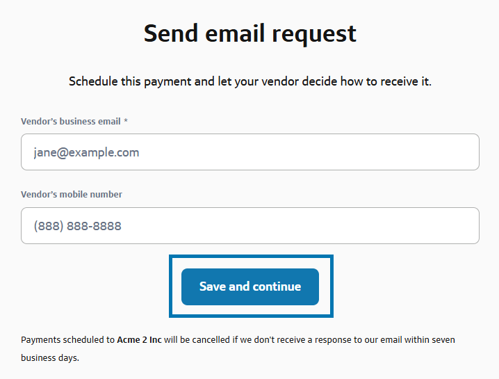 The link remains valid for 7 business days. If your vendor does not submit their details within this timeframe, any scheduled payment will be canceled, and you’ll receive an email notification.
