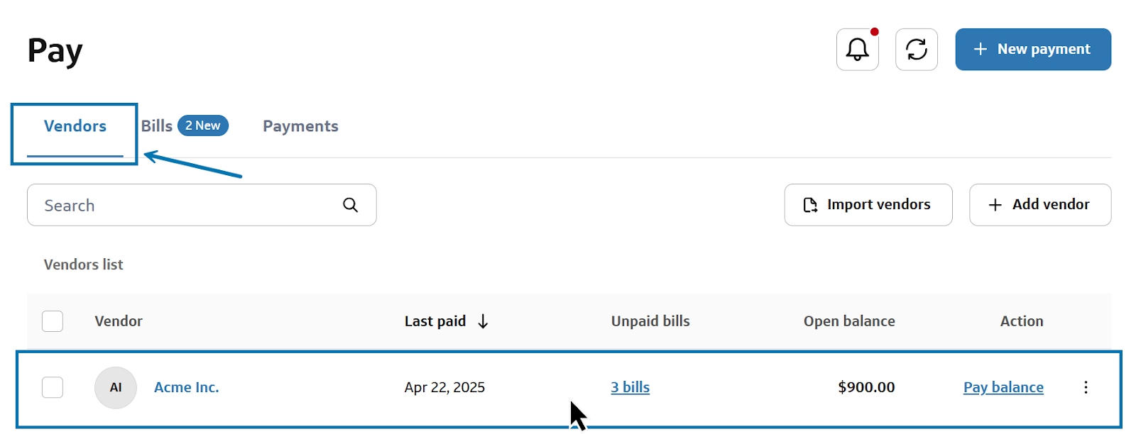 1 - From the Pay dashboard, select the Vendors tab.