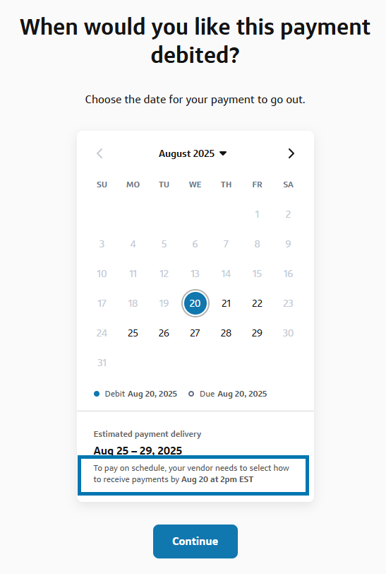 • Payment delivery time depends on when your vendor fills out their details. Once they do, you’ll receive an email notification with an estimated time of delivery, based on typical delivery timelines.