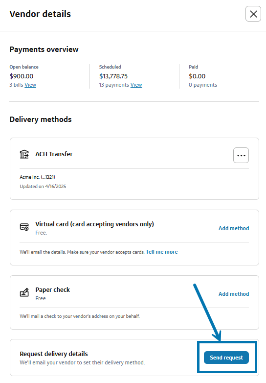 No worries! You can still send your vendor a request to update their preferred method of payment. Their response will be saved for all future payments and updated automatically after they submit the delivery details.