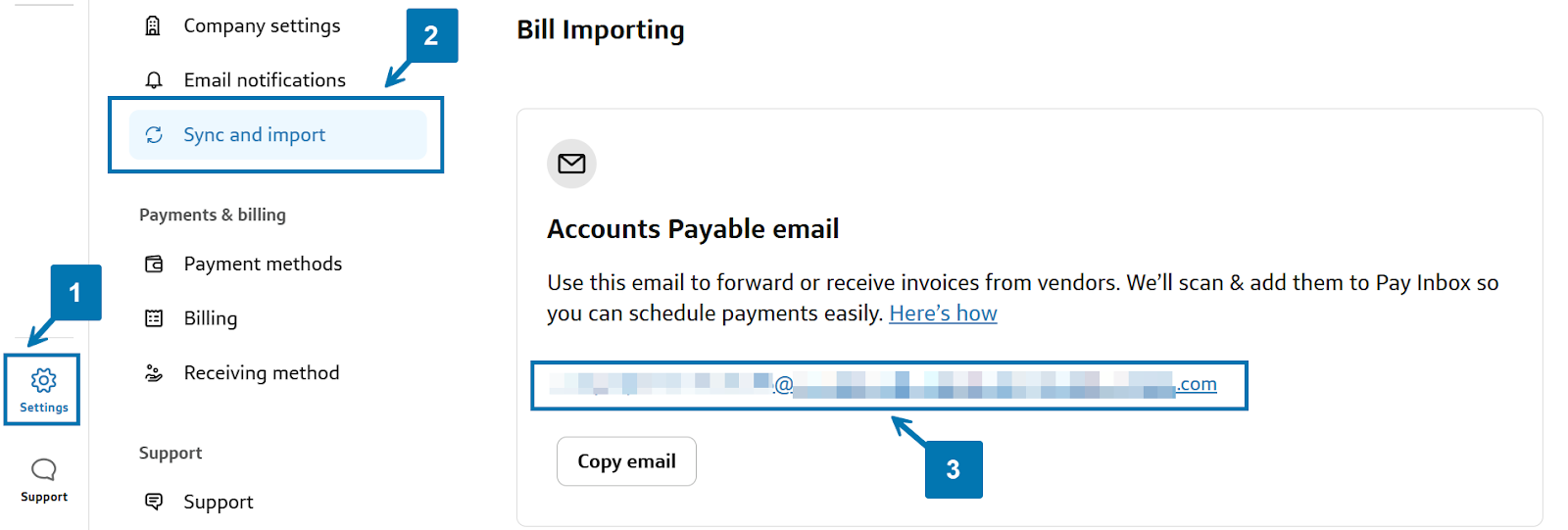 3 - A pop-up will appear with your unique Accounts Payable email address - just copy it and share it with your vendors.