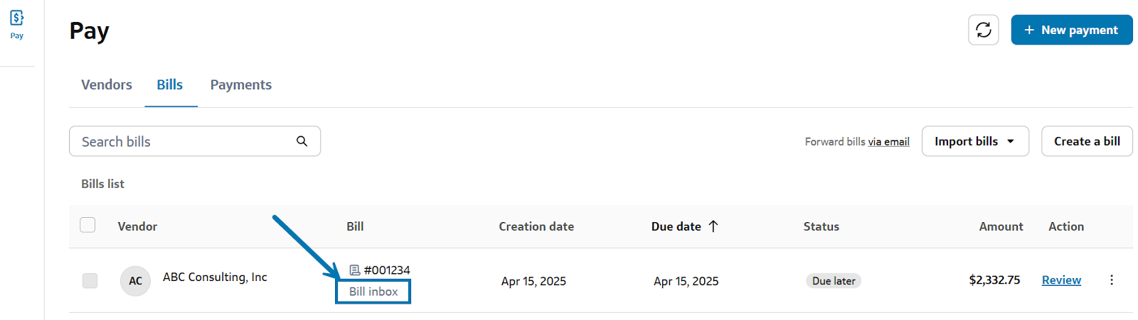 - It will be marked with a “Bill inbox” tag, indicating it came via email.