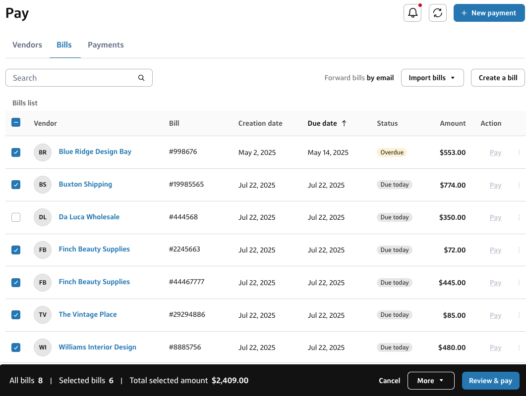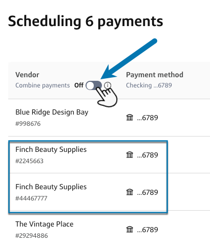 If you have multiple bills for the same vendor, you can combine all the bills into one payment. Your vendor will get a full breakdown of the bill for easy reconciliation. To combine bills, toggle on Combine payments.