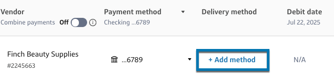 Ask a vendor to fill out their payment details if you don't know their delivery method by selecting +Add method.
