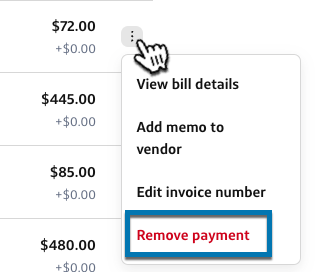 Add a memo to the vendor (optional): Select the three dots next to the amount and select Add memo to vendor from the dropdown list.