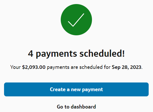 7- Payments are scheduled. Select Create a new payment if you want to make another payment. Alternatively, select Go to dashboard. You will get back to the Bills tab where you started.